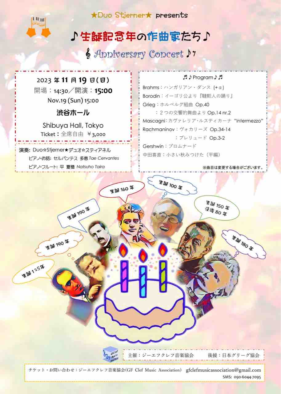 October 04, 2023 生誕記念年の作曲家たち ♪ AnniversaryConcert ♪ カテゴリ:協会主催コンサートこれから 今年、生誕〇〇〇年を迎える作曲家たちの作品を一堂に集めました。少しずつなのでオードブルのような、お味見のような…でも味が美味しいことは充分伝わるはず?!ですので、どうぞテイスティングにいらしてくださいデュオ★スティアネルならではのオリジナル なスパイスもちょっと加えて織りなす音の旅にご一緒できたら大変うれしいです日にち: 2023年11月19日(日)時間: 15:00〜開演(開場 14:30)場所: 渋谷ホール(東京・渋谷駅)チケット: 全席自由 ¥3,000-チケット予約・お問い合わせ: gfclefmusicassociation@gmail.com タグ :#生誕#デュオ#室内楽#Duo★Stjerner 「協会主催コンサート」カテゴリの最新記事 旅立ちコンサート